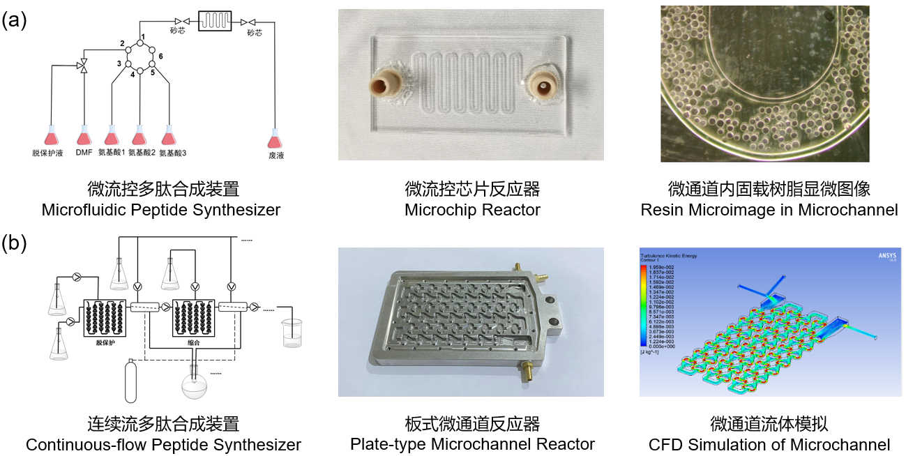 Peptide drugs are a key research direction in the field of biomedicine and have attracted much attention in recent years. Conventional peptide synthesis methods require excessive amounts of expensive reagents and cumbersome purification steps. Although solid-phase methods simplify the purification of peptides, they still suffer from low spatiotemporal efficiency, time-consuming preparation, and high reagent loss. Therefore, it has become important to develop high-yield, fast, and efficient synthesis methods. Continuous flow chemistry, including microfluidics, is a flow reaction at a tiny characteristic scale (reaction space ≤ 1 mm), which is characterized by high mass and heat transfer efficiency, high mixing capacity, good reproducibility, and easy scale-up. We have developed a microfluidic solid-phase peptide synthesis process for the drug discovery stage and a continuous-flow solid-phase peptide production process for the industrialized production scenario, which reduces the peptide preparation time by nearly 80%, and further promotes the development of intelligent reaction equipment with auto-adjustment and real-time monitoring capabilities by using advanced sensing and automatic control algorithms.