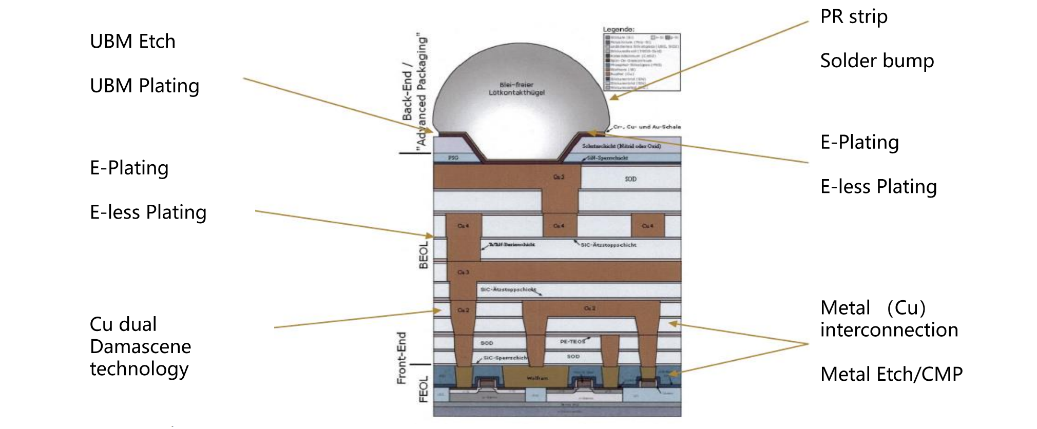 Packaging refers to the process of cutting and welding the wafer after wafer fabrication, and connecting the circuit with external devices. Then plastic sealing to provide mechanical protection for the chip from physical, chemical and other environmental factors damage. With the development of packaging technology, metallized film deposition process is needed in TSV, RDL and bumping process, which involves chemical nickel palladium, chemical nickel gold, electroplated copper and so on. We cooperate with enterprises to research and develop processes in the field of electronic plating, and plating solutions. The development of independent high-end packaging processes and materials is an important support for breaking through the technological blockade imposed by Western countries on China's semiconductor industry.