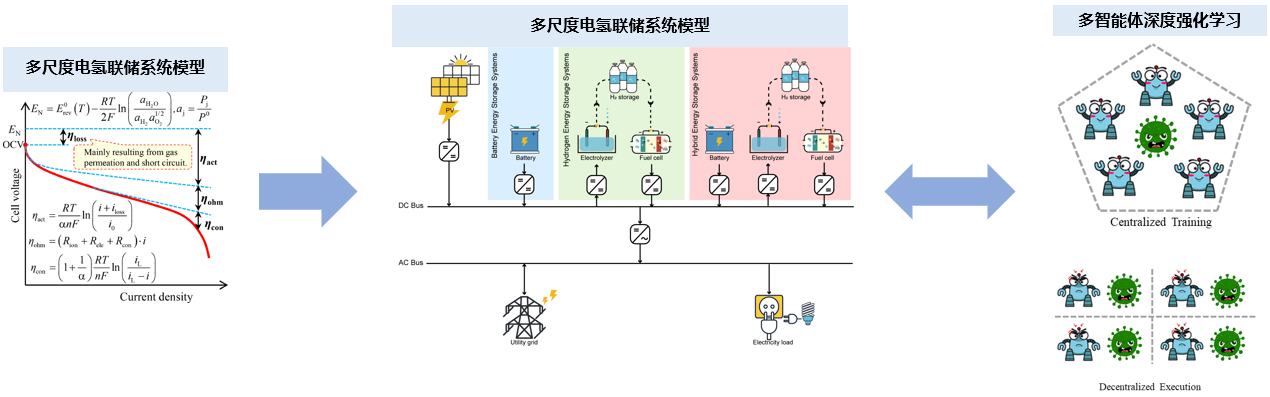 电氢联储系统结合电池储能系统的快速响应、高效率、低功率成本以及氢储能系统能量密度高、功率容量解耦、低容量成本优势,有望形成有效的时空和规模互补、满足不同时间尺度响应需求的经济性储能综合方案。为了更精确的评估电氢联储系统的经济、运行特性,我们从系统设备底层电化学模型出发,开发高保真度的多尺度电氢联储系统模型。同时依托高保真度的模型,开发基于深度强化学习的电氢联储系统能源管理方法,以实现系统在不同场景下的低成本运行。