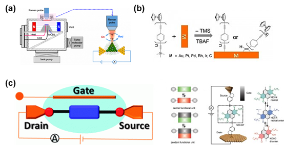 (a) Characterization of electrical transport properties at single-molecule scale provides not only indirect static characterization of molecular-metal electrode coupling state, adsorption configuration and conformational changes, but also direct and dynamic monitoring of chemical reactions at single-molecule scale. In addition, we are also committed to studying the significant catalytic effect of chemical reactions at single-molecule scale by the oriented external electric fields within the metal electrodes gap. However, the conductance property cannot feedback the energy resolution, so we need to directly characterize the structure of the molecular junction by means of spectroscopy. Therefore, we aim to develop the microchip based, simultaneous and real-time Raman spectroscopic and electrical characterization technology, to characterize the molecular structure, reaction state and intermediates, thus to construct the structure-property relationship between the structures of molecular junction and the electrical transport properties. Furthermore, we will also consider the change of Raman spectra of molecular junction under the influence of electric transport process, and investigate the physical and chemical enhancement mechanism of Raman spectra.