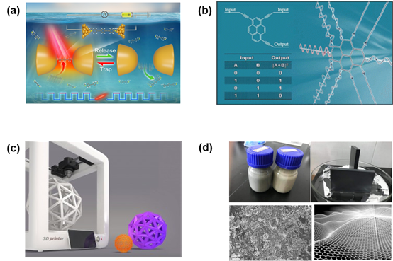 (c) We are trying to develop a novel technique exploring the potential of 3D printing technique in the bottom-up fabrication of molecular materials via layer-by layer click-chemistry and self-assembly of organic molecules.