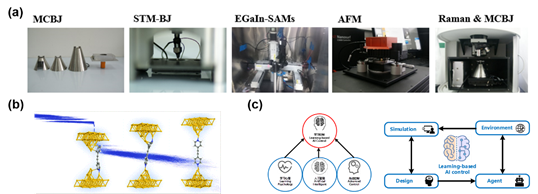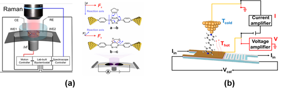 (a) There is a Chinese proverb said: sharp tools make good work. We are developing cutting-edge instruments and technique for single-molecule scale charge transport, spectroscopic, electrochemical and catalytic studies.