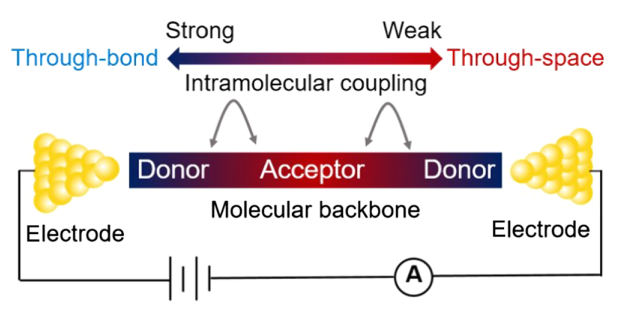 单个分子电子输运方式的调节是设计和制备分子电路的重点内容,一直是分子电子学领域研究的核心问题。针对这一方面的研究,本人所在课题组自主开发了单分子结电信号闪烁噪声的采集和分析方法,用以分析单分子结中电子通过键和通过空间的输运特性。我们与中科院化学所张德清研究员、兰州大学张浩力教授、刘子桐教授课题组合作,设计了一系列两侧接有不同芳环的吡咯并吡咯二酮(Diketopyrrolopyrrole, DPP)分子,通过对分子内DA作用强度的操纵有效调节了分子内电子的输运势垒,从而使电子的输运方式经历了从通过空间输运向通过键输运的转变。该工作首次关注了分子结中分子骨架的内部势垒,为实现单分子结中通过键和通过空间电输运的精准调控提供了有效方法。