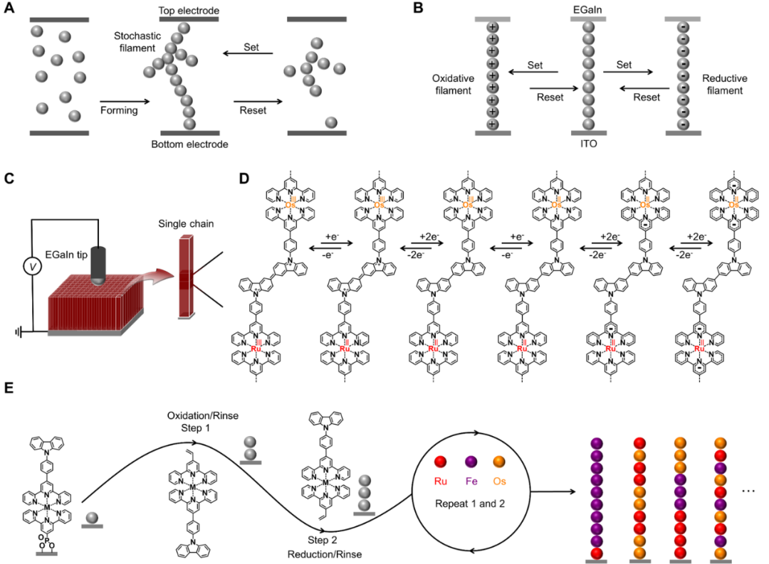 图1:论文TOC: (A)导电灯丝的随机生成与断裂;(B)聚合物单层稳定的导电通道;(C)EGaIn电极测试测试示意图;