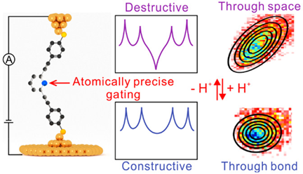 单分子量子干涉效应有望应用于制备高性能的分子电学器件。然而,对量子干涉效应的调控依然存在较大挑战。类似于光的干涉,量子干涉也具有相增与相消干涉两种模式。如果能够实现对两种干涉模式的直接切换,则有望实现对分子电学性质的显著调控。分子量子干涉的模式显著受前线轨道的影响,如果能够施加原子级精确的电场,则有望定向操纵分子的前线轨道,使量子干涉模式发生完全的切换。近日,洪文晶教授课题组与厦门大学/南方科技大学夏海平教授、英国华威大学Hatef Sadeghi副教授课题组合作,开发了原子级精确化学门控策略:利用吡啶氮与阳离子试剂的化学反应选择性,对分子前线轨道施加非均匀的电场效应,进而诱导前线轨道交叉,实现相增与相消量子干涉模式的完全切换。基于此,分子结不仅表现出超过一个数量级的电导差异,而且通过闪烁噪声分析表明,电荷输运方式也发生了从经由空间到经由化学键耦合的过渡。