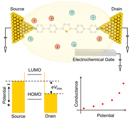 信息技术的飞速发展为电子器件小型化提出了更高的要求,随着晶体管器件中尺寸逐渐减小,导电沟道也逐渐向单分子尺寸发展。单分子电化学门控晶体管作为一种新型单分子器件,采用单个功能分子作为导电沟道,借鉴传统离子栅晶体管结构,以电极界面双电层作为器件介电层,从而大幅度提高栅极调控效率,简化器件制备工艺,因此引起了科研工作者的广泛关注。单分子电化学门控晶体管的研究不仅为电子器件进一步小型化开辟了新的途径,也对深入理解单分子尺度独特的电子传输过程具有重要的意义。