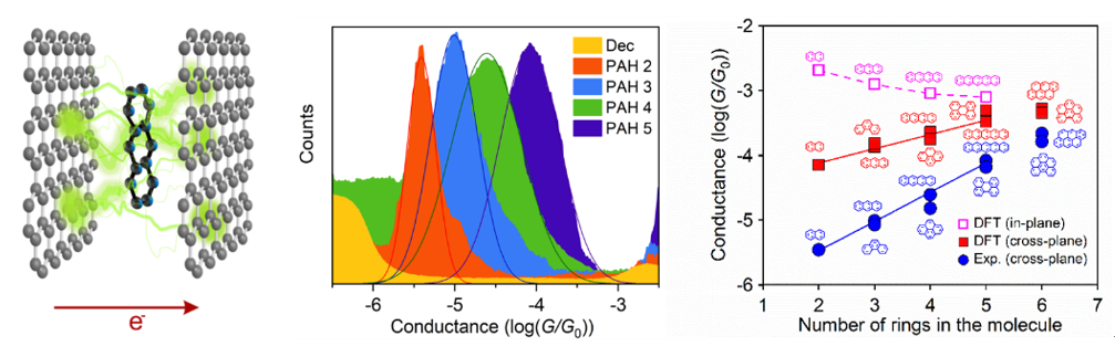 π-Lab通过自主发展能够精准构筑和表征单分子器件的科学仪器技术,实现了两片单层石墨烯电极间距的精确调控,以此将单个平面有机分子连接在两片单层石墨烯电极之间,从而构筑了具有三明治结构、导电通道长度仅为单原子层厚度的单分子范德华异质结器件。进一步选用9种多环芳烃化合物构筑出了一系列单分子二维范德华异质结,并实现了对该类器件的电输运性质的系统电学表征。与传统的单分子电子器件所通过面内输运(in-plane)不同的是,单分子二维范德华异质结的电输运是采用层间输运(cross-plane transport)。虽然导电通道仅有单原子层厚度,但是通过对分子共轭程度乃至拓扑结构的精细调节仍然可以显著改变单分子电子器件的电子输运能力。该工作所发展的构筑技术,还可以拓展到其他二维材料和分子体系,从而为新型单分子二维材料范德华异质结器件的设计、构筑和表征,提供了独特的表征技术和研究方法。