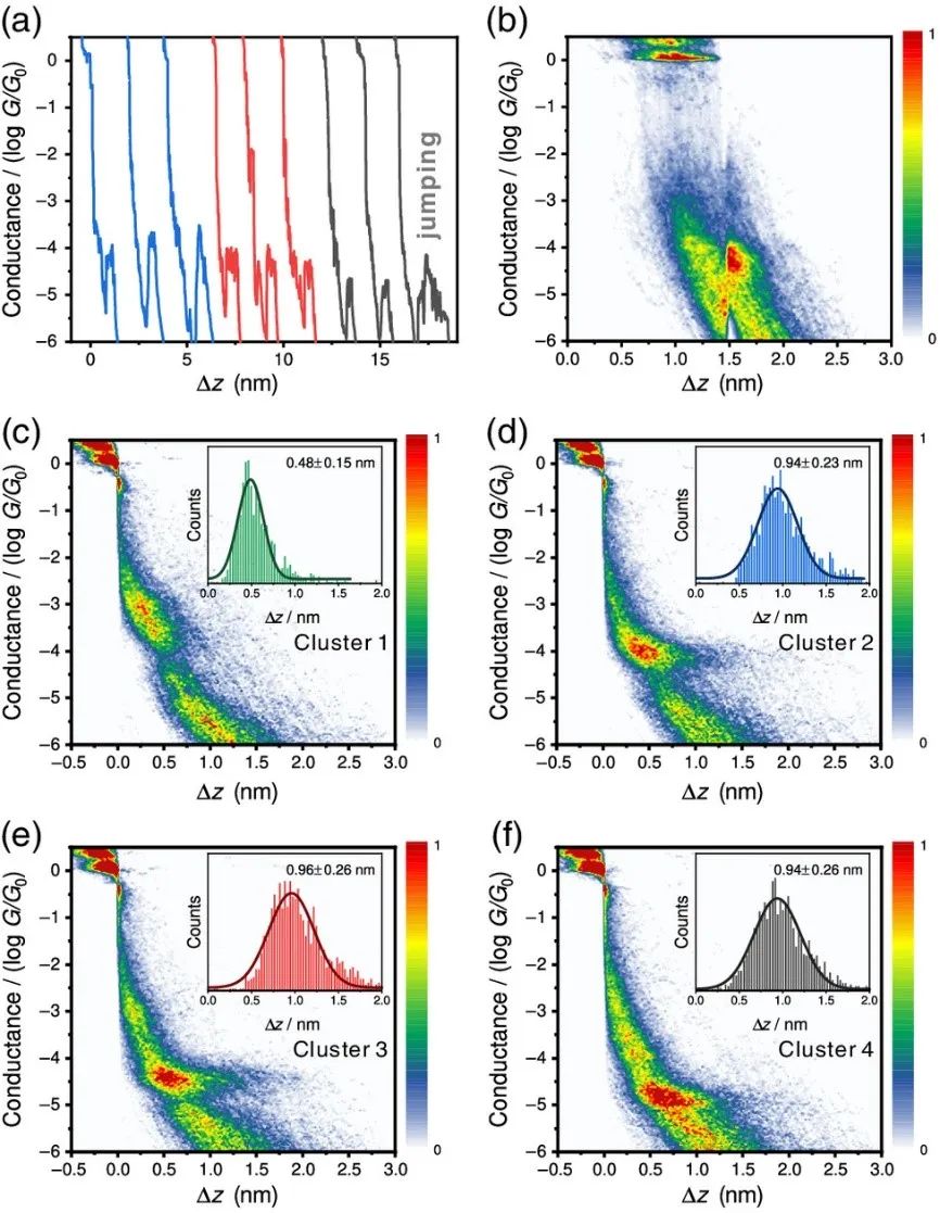 本文通过STM-BJ技术进行单分子结构筑,随着金电极的不断开合,SSP分子结在外力作用下形成开环的SMC化合物,电导-距离曲线呈现多种分布情况(图1)。进一步通过无监督谱聚类算法对4000余条数据进行聚类处理,原始数据可被分为四类,意味着此过程中存在四种具有不同电导的分子结构型。