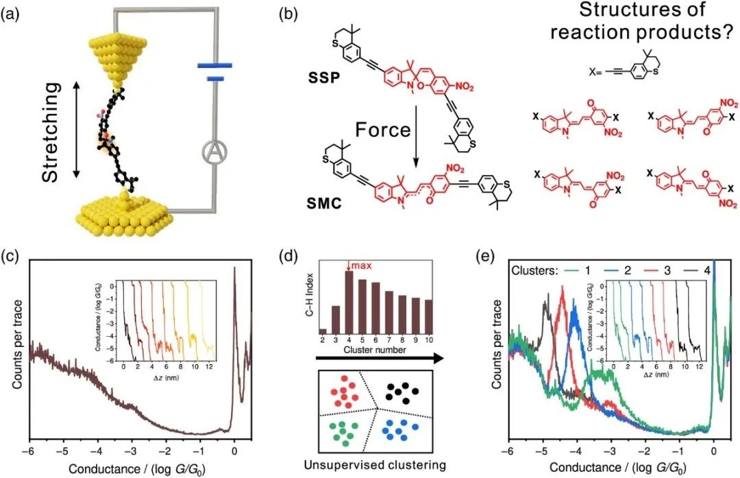 综上所述,该研究报道了硫醚官能化螺吡喃(SSP)衍生物在单分子尺度的原位力致化学反应前后的结构变化,揭示了此单分子反应体系中不同的电导所对应的分子结构和构型,证实了结合聚类算法的单分子电学表征可用于鉴别力诱导反应中产生的不同异构体结构,揭示了单分子裂结技术在化学反应结构分析中的巨大潜力。
