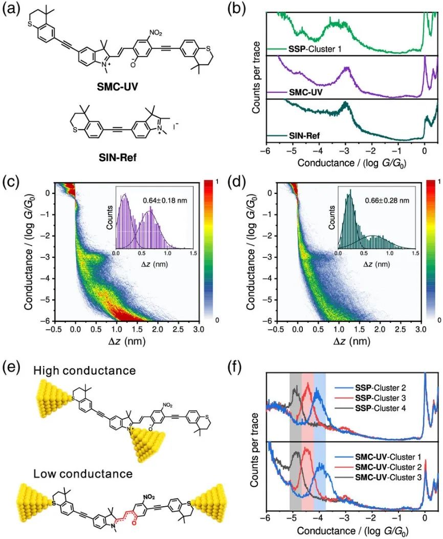 为明确上述具有短台阶构型的第一类电导-距离曲线的来源,本文中设计了光照开环对照化合物(SMC-UV)及长度约为SSP分子一半的二氢吲哚端基对照分子(SIN-Ref),并分别对其进行了单分子电学表征测试,发现SMC-UV与SIN-Ref均具有一个电导较高、长度较短的信号,与SSP分子结中的第一类曲线类似。同时,SMC-UV的测试结果显示其具有一个较低的电导值,进一步将其进行聚类分析,可得到与SSP分子结接近的第二至四类电导统计图。因此,可推知SSP分子结中第一类电导曲线源自未被完全拉伸的SSP/SMC-UV分子构型(图3)。