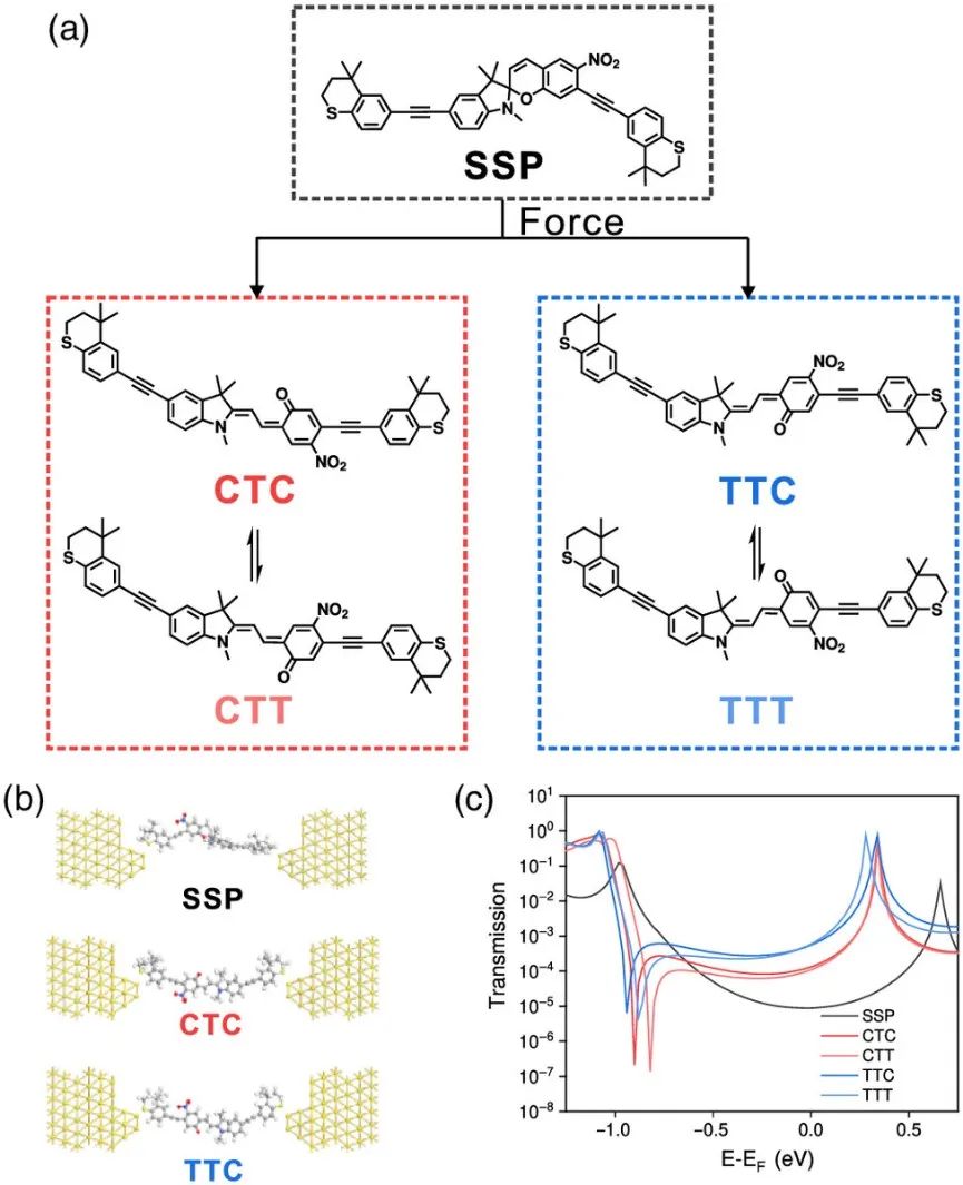 最后,通过引入密度泛函-非平衡格林函数(DFT-NEGF)理论计算辅助,对闭环的SSP及其受力开环后的产物异构体进行透射谱计算,当SSP转变为更为平面化的SMC时,共轭增强,该反应体系中不同结构电导值从低到高的顺序为SSP<CTC≈ CTT<TTC≈ TTT。根据以上结果,可指认SSP分子结中第二至四类的分子结的来源依次是TTC/TTT、CTC/CTC以及未发生开环的SSP(图4)。