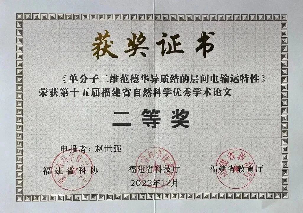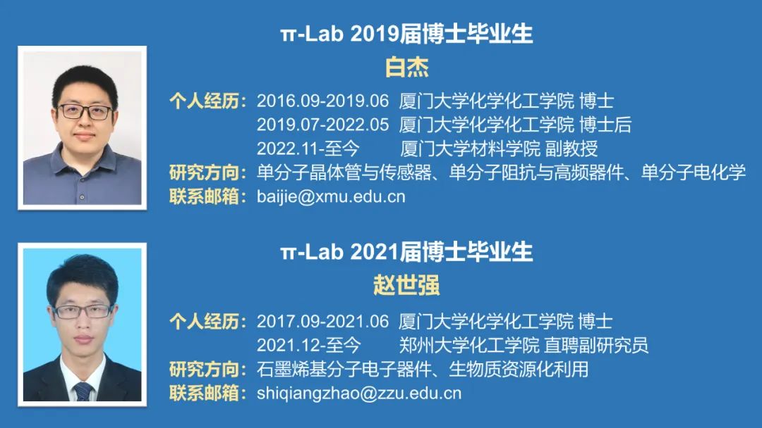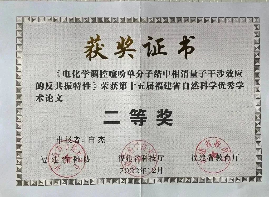 其中,有两位π-Laber的学术论文获得该项二等奖,分别是2019届博士毕业生、厦门大学材料学院白杰副教授的《电化学调控噻吩单分子结中相消量子干涉效应的反共振特性》和2021届博士毕业生、郑州大学化工学院赵世强副研究员的《单分子二维范德华异质结的层间电输运特性》。