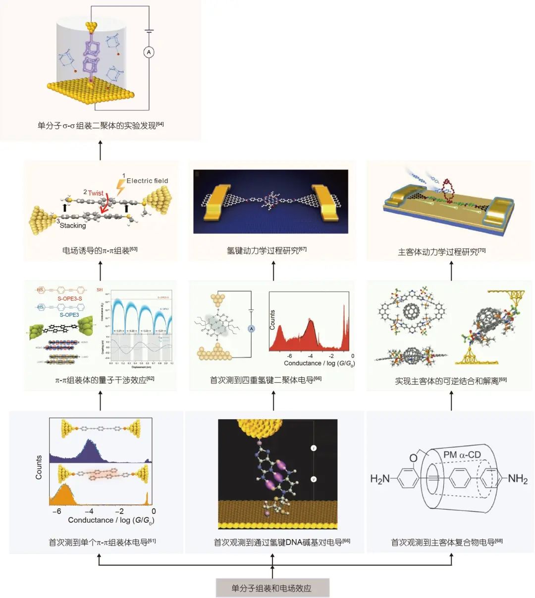 2008年,Calame团队以只具有一个连接基团的寡聚乙烯分子取代了传统具有两个连接基团的分子,从而使用MCBJ技术实现了两个分子之间π-π堆叠相互作用的表征.实验研究发现了这种方式构筑的超分子结具有与单分子结比拟的稳定性,但同等长度电导差异接近1个数量级.2016年,van der Zant团队通过精确调控π-π堆叠相互作用的超分子结的电极间距离,观测到了在特定构型中超分子结的量子干涉效应,以及拉伸过程中分子结在相长干涉和相消干涉效应中的切换.在量子干涉效应之外,科研人员也开始关注组装过程的电场效应等新奇的物理化学效应.2020年,洪文晶团队采用STMBJ技术,发现了电场能够增强基于π-π堆叠的超分子器件的成结概率,其机制是电场能够使电极间的分子构型变得更为平面而有利于分子间的组装过程.