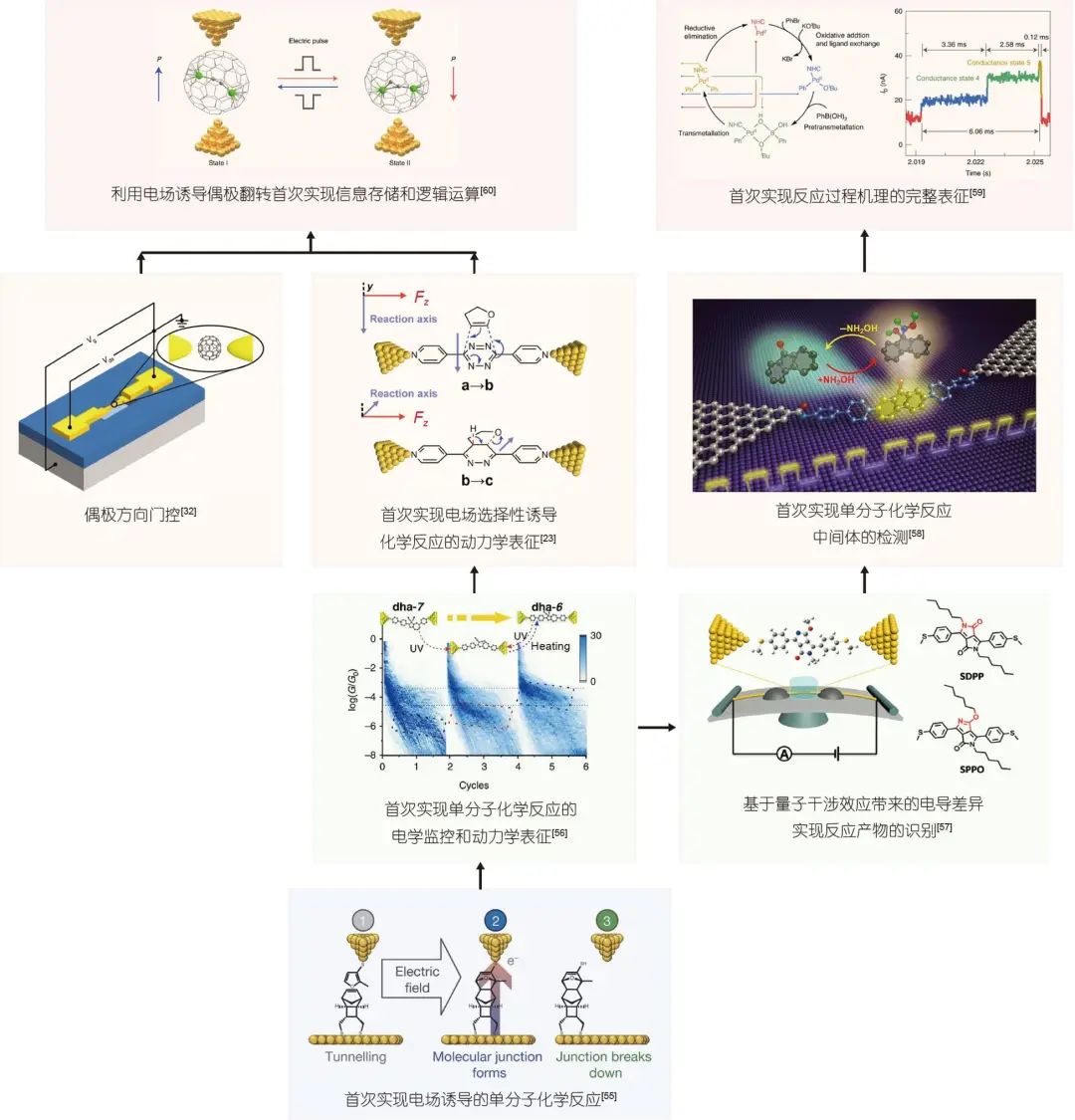 近年来,单分子电子学研究出现了一个全新的研究趋势,也就是不再以器件的大规模集成作为终极目标,而是将其作为单分子尺度物理化学的表征方法和研究工具,这也引出了上文提出的第二个问题,单分子电子学表征方法能否成为科研人员认识单分子尺度物理化学过程的独特研究工具?