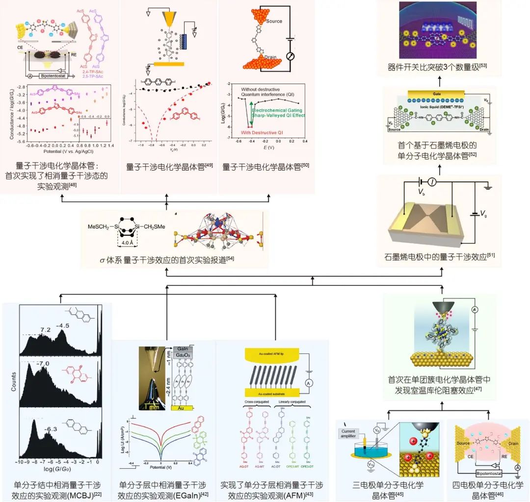 科研人员也探索了石墨烯电极的量子干涉效应.2016年,Mol团队与Briggs团队合作,发现了纳米尺度的石墨烯电极存在量子干涉效应.2018年,郭雪峰团队制备了基于石墨烯电极的单分子电化学晶体管,开关比接近1个数量级.2022年,郭雪峰团队制备了卟啉基单分子电化学晶体管,获得了~4800的开关比和~179mV/dec的调控效率,这也是目前单分子电化学晶体管的最高调控效率,也正在逐步接近现有硅基晶体管的器件水平.