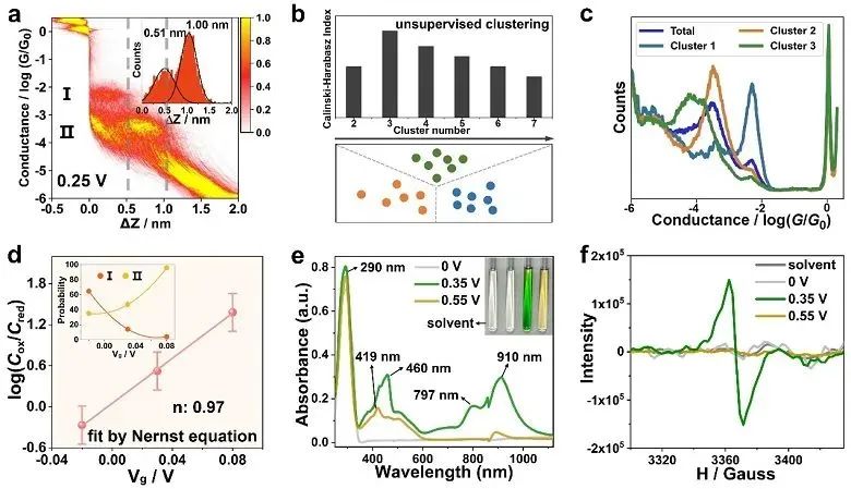 为了进一步揭示在单分子尺度下所形成的分子结构型,研究者通过无监督谱聚类算法对典型的0.25 V电位下的二维电导测试结果进行分析。根据二维电导测试的信号特征,其电导被分为三类,分别对应于3,3′,5,5′-四甲基联苯胺单个分子结、3,3′,5,5′-四甲基联苯胺所形成的超分子结和3,3′,5,5′-四甲基联苯胺所形成的超分子自由基结的构型。通过对其它电位进行谱聚类并采用能斯特方程拟合,得出在单分子尺度下发生第一步氧化反应后为单电子转移过程,这一结论与循环伏安测试的结果以及反应机理一致。为了进一步证实在单分子尺度下所形成了超分子自由基,研究者通过固定电位进行30分钟的稳定测试,富集其产物后采用电子自旋共振仪和紫外吸收光谱进行表征,明显的自由基信号以及797和 910 nm处的吸收信号,证实了在第一步发生氧化反应后形成了自由基物种。
