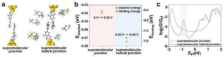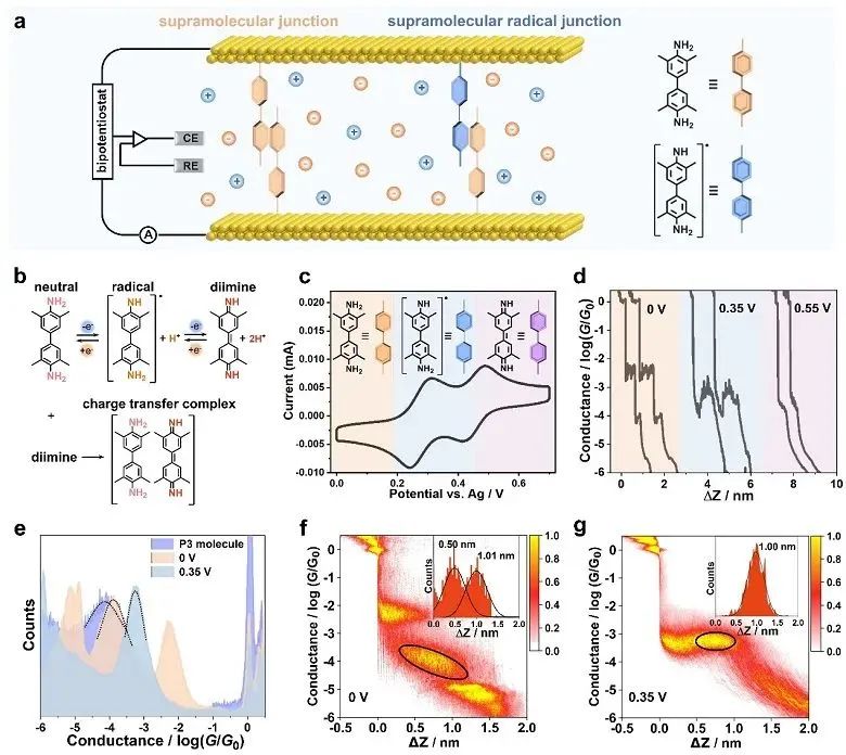面对这一挑战,最近厦门大学化学化工学院洪文晶教授课题组与英国华威大学的Hatef Sadeghi副教授课题组合作,采用自主搭建的电化学扫描隧道显微镜断裂结(EC-STM-BJ)技术原位制备了相同化学结构的超分子结和超分子自由基结,并研究了它们的电荷输运特性。在该工作中,研究者发现超分子自由基结的电导比没有自由基的超分子结高了一个数量级,甚至高于具有相似长度且完全共轭的4,4'-二氨基三联苯分子结的电导。