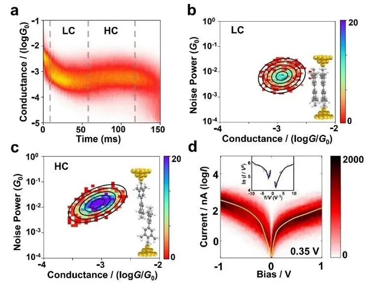 闪烁噪声实验可以区分单个分子结和单个超分子结的电输运机制,研究者进行了不同电位下的闪烁噪声测试并对测试数据分析,进一步证实在0.35 V电位下发生第一氧化反应后形成了超分子自由基结。为了揭示超分子自由基呈现出的高电导现象,研究者进行了电流-电压实验并采用Fowler−Nordheim方程进行拟合,得到0.35 V电位下的转换电压谱,转换电压谱显示在0.35 V电位下其绝对值小于0 V和0.55 V,证明所形成的超分子自由基结的HOMO接近费米能级。