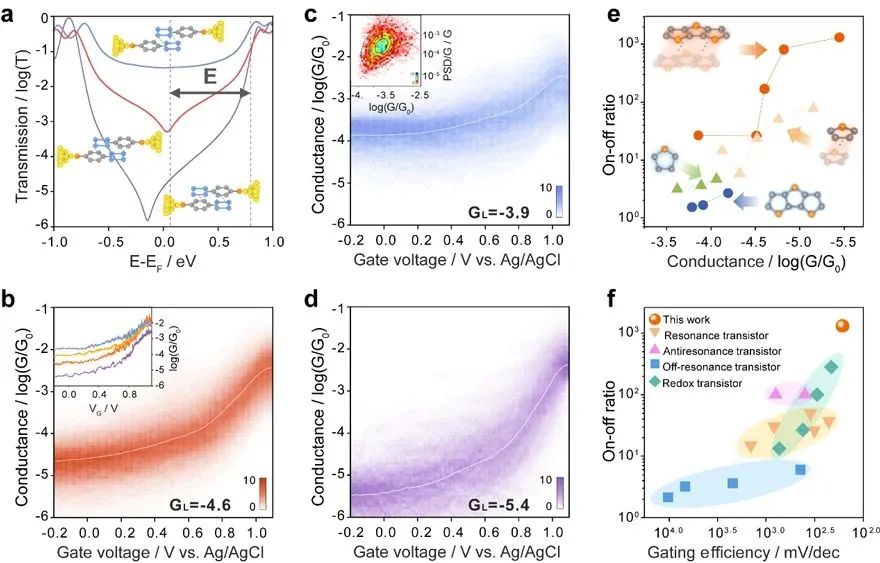 更重要的是,π-π堆积TPCOs超分子导电沟道电子输运过程中的量子干涉效应具有超分子构型依赖性(图2a),从而决定了超分子晶体管的场效应性能。然而,由于超分子结构的复杂性和动态性,实现精确的构型控制具有较高难度。因此,如何实现对超分子导电沟道的构型控制,是推动超分子晶体管向更高性能、更多功能方向发展的关键挑战。在此,研究者以电导作为反馈,控制源漏极电极的纳米间距实现了对TPCOs超分子导电沟道多种不同构型的精确控制,从而实现了对电子输运过程中不同量子干涉效应的原位调控。实验结果显示同一分子不同超分子构型的场效应性能表现出显著差异,揭示了超分子导电沟道构型依赖的晶体管行为(图2b-d)。对具有不同共轭结构的超分子和单分子晶体管的系统研究进一步证实了增大TPCOs共轭面积在提高晶体管开关比方面的重要性(图2e)。基于TPCOs超分子导电沟道材料,研究者实现了开关比高达1300、源-漏极关态漏电流低至30 pA,且沟道长度小于2 nm的超分子晶体管。与之前文献报道的基于共振隧穿、反共振隧穿和氧化还原机制的单分子晶体管相比,具有更高的开关比和门控效率。