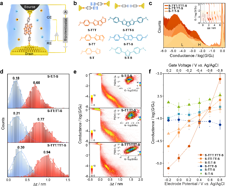 洪文晶教授团队通过与兰州大学刘子桐教授合作,设计合成了如图1b所示的系列TPCOs分子,其中具有单端硫甲基修饰的TPCOs分子可以通过π-π堆积分子间相互作用在源漏电极间构筑超分子导电沟道,具有双端硫甲基修饰的TPCOs分子可以直接通过金-硫键在源漏电极间构筑形成单分子导电沟道。通过采用电化学门控-扫描隧道显微镜裂结技术对TPCOs超分子导电沟道和对应单分子导电沟道场效应性能分析发现,超分子导电沟道开关比随着分子并噻吩个数的增加显著增加而对应单分子的开关比并无显著变化,其中S-TTT:TTT-S超分子晶体管的开关比是对应S-TTT-S单分子晶体管的70余倍(图1f),这主要是S-TTT超分子结构在优势构型下具有相消量子干涉效应引起的。