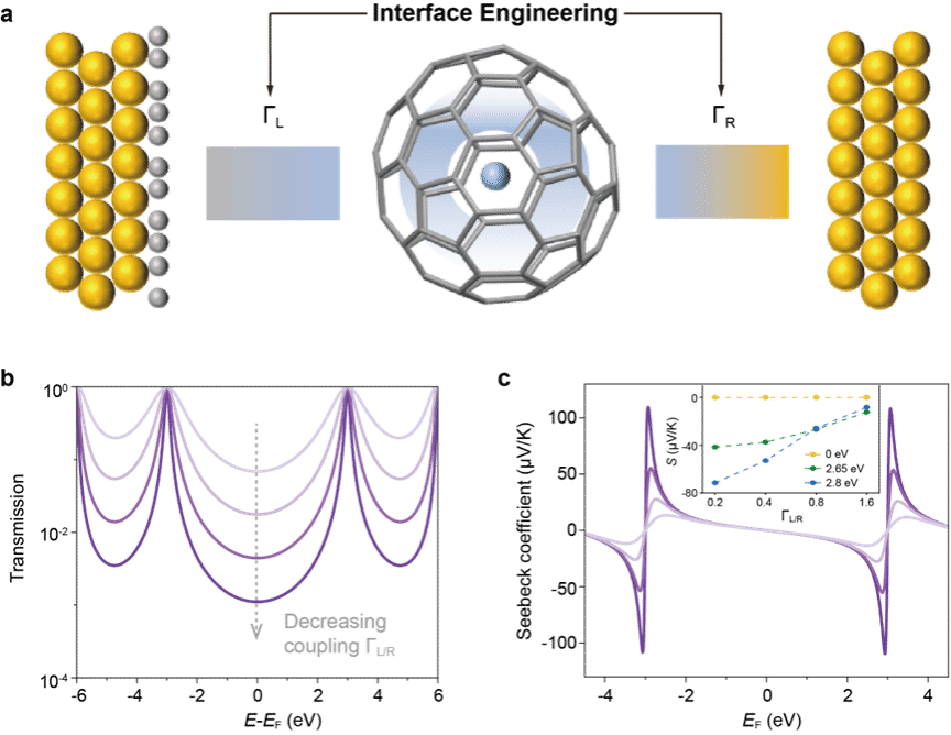 随着电子器件不断向微型化和高密度集成方向发展,单分子热电器件因其在片上热管理方面展现出的潜力而受到广泛关注,也是未来分子智能芯片的关键技术之一。在众多分子材料体系中,基于富勒烯的分子结已被实验证实可产生显著高于传统有机体系的热电势。理论研究进一步表明,当分子与电极之间的耦合被有效削弱,甚至实现解耦时,其热电势有望得到进一步提升。