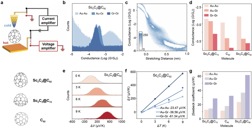 在确认形成单分子结后,通过施加可控温差并拟合热电压-ΔT关系得到塞贝克系数。结果显示,对三种富勒烯而言,塞贝克系数的绝对值均从Au-Au到Au-Gr再到Gr-Gr逐渐增大。其中Gr-Sc₂C₂@-C₈₂-Gr的塞贝克系数高达-61.34 μV/K,是目前报道过的富勒烯基单分子器件中的最高纪录。