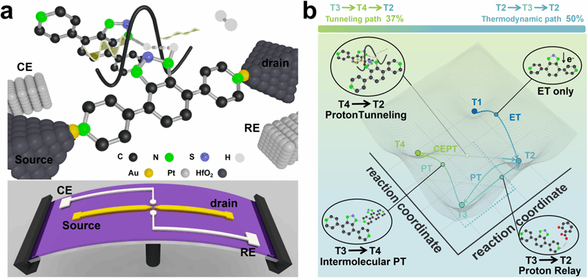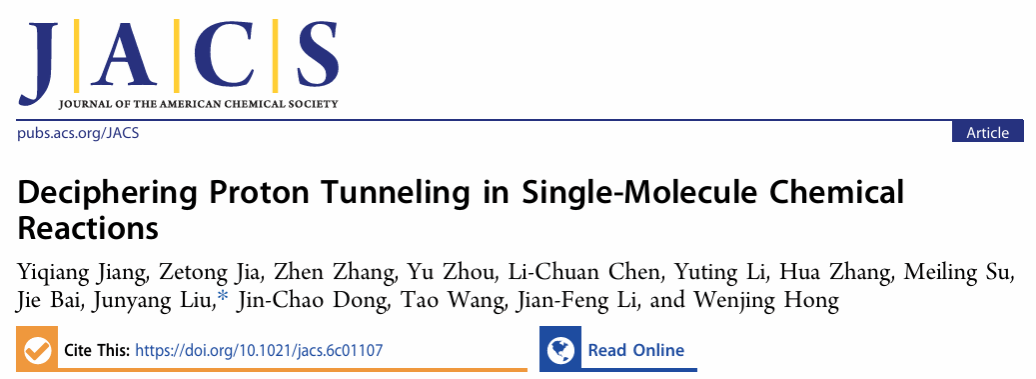 近日,厦门大学洪文晶教授团队的刘俊扬副教授课题组在《Journal of the American Chemical Society》上发表题为“Deciphering proton tunneling in single-molecule chemical reactions”的研究成果。在微观世界里,化学反应通常被理解为分子“翻越”能量山丘的过程。但有一种神奇的量子效应—质子隧穿,能让质子像拥有“穿墙术”一样,直接穿透能量壁垒,从而大幅提升反应效率。然而,这种效应在室温下的真实贡献一直难以被直接观测和量化。现在,研究团队通过自主搭建的“单分子电化学芯片”,成功在单个分子上实时“看到”了催化反应的全过程,首次精准量化了质子隧穿在不同反应步骤中的贡献,并发现通过调节反应环境,可以将隧穿路径的比例从13%提升至42%。这项研究为设计更高效、更节能的催化系统开辟了全新思路。