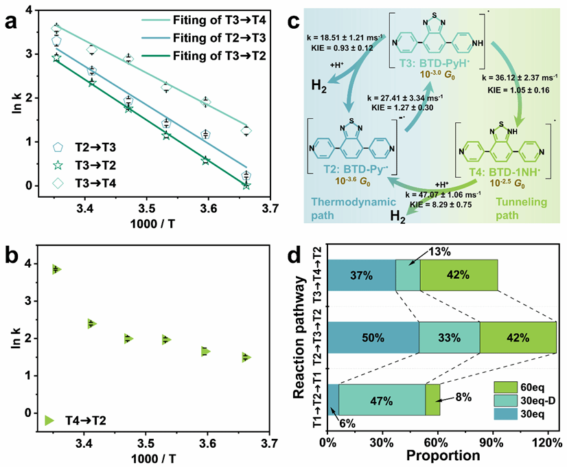 通过这种“监听”方式,团队成功在单个分子上,区分出了从反应物到产物的5个关键中间状态(T1-T5),并像看慢动作回放一样,追踪了分子在不同电化学栅压下的状态转换过程,获取了各种反应路径支线以及他们的占比。T1→T2→T1是BTD分子自身得失电子的过程,T2→T3→T2是BTD分子的吡啶氮活性通过“爬坡”行为发生的动力学析氢过程,T3→T4→T2则反映了吡啶氮将质子转移给噻二唑氮位点,并进一步通过“穿墙”发生了质子隧穿主导的析氢过程。