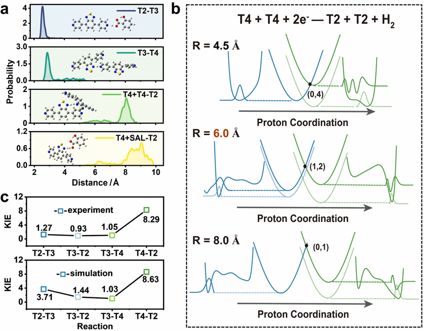 为了从理论层面解释这一现象,团队进行了分子动力学模拟和微观动力学分析(图4)。团队发现,质子“穿墙”的概率取决于供体-受体之间的距离(R)。这个距离太近,壁垒太浅,隧穿优势不明显;太远,隧穿又难以发生。只有当距离恰到好处时(约6.0 Å),质子的波函数(可以理解为它的“位置云”)才能发生最大程度的交叠,从而高效地实现“穿墙”。而团队正是通过调节反应环境,让分子更频繁地处于这个“最佳距离”,从而放大了量子隧穿效应。
