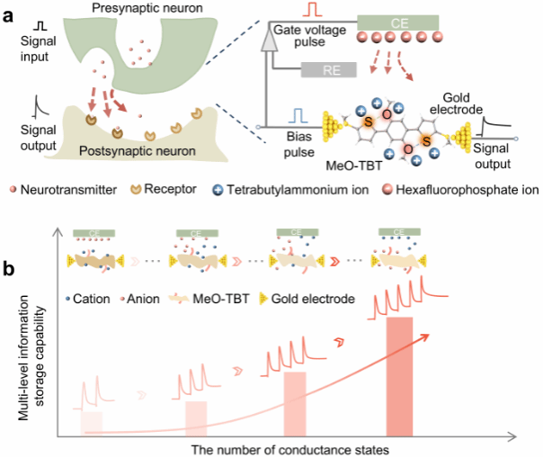 研究团队选用了一种名为MeO-TBT的分子作为功能核心,并利用电化学栅控的单分子可控裂结技术,在两个电极之间搭建并稳定悬停住单分子结。如果把这个器件类比为一个人工突触,那么: