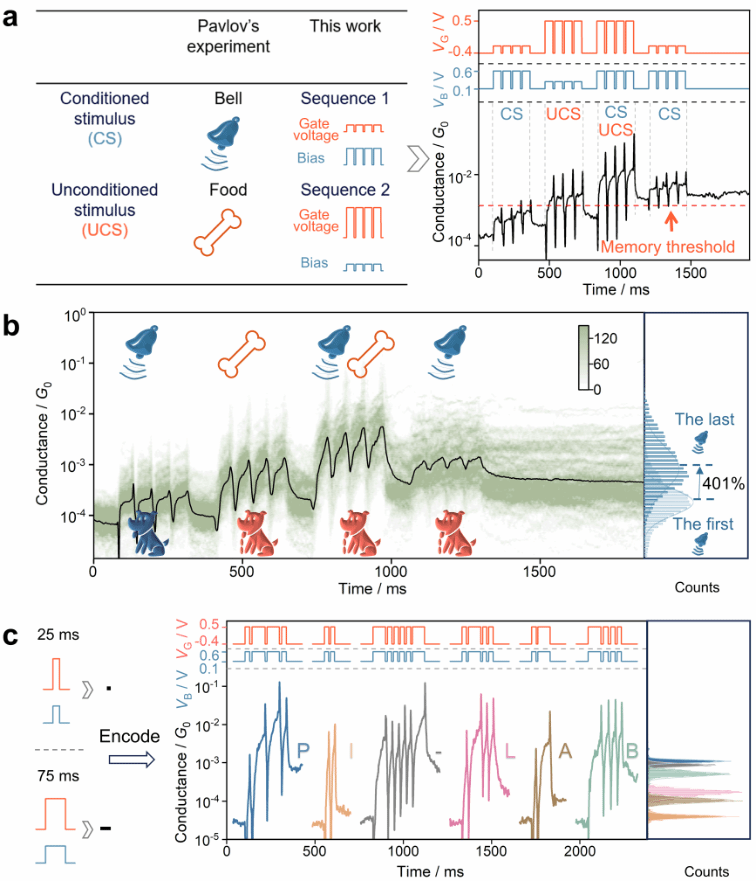 大家熟悉的巴甫洛夫实验里,狗原本只会对食物分泌唾液;但如果把铃声和食物反复同时出现,最后狗听到铃声也会产生反应。这本质上是一种联想学习:两个原本没有直接关系的刺激,因为反复共同出现,建立了连接。在这项工作中,研究团队用不同电脉冲输入来模拟这种过程。通过协同刺激,单分子器件逐渐建立起稳定响应,实现了类似条件反射的行为。这说明器件不只是“被动导电”,而是具有了最基础的联想学习功能。