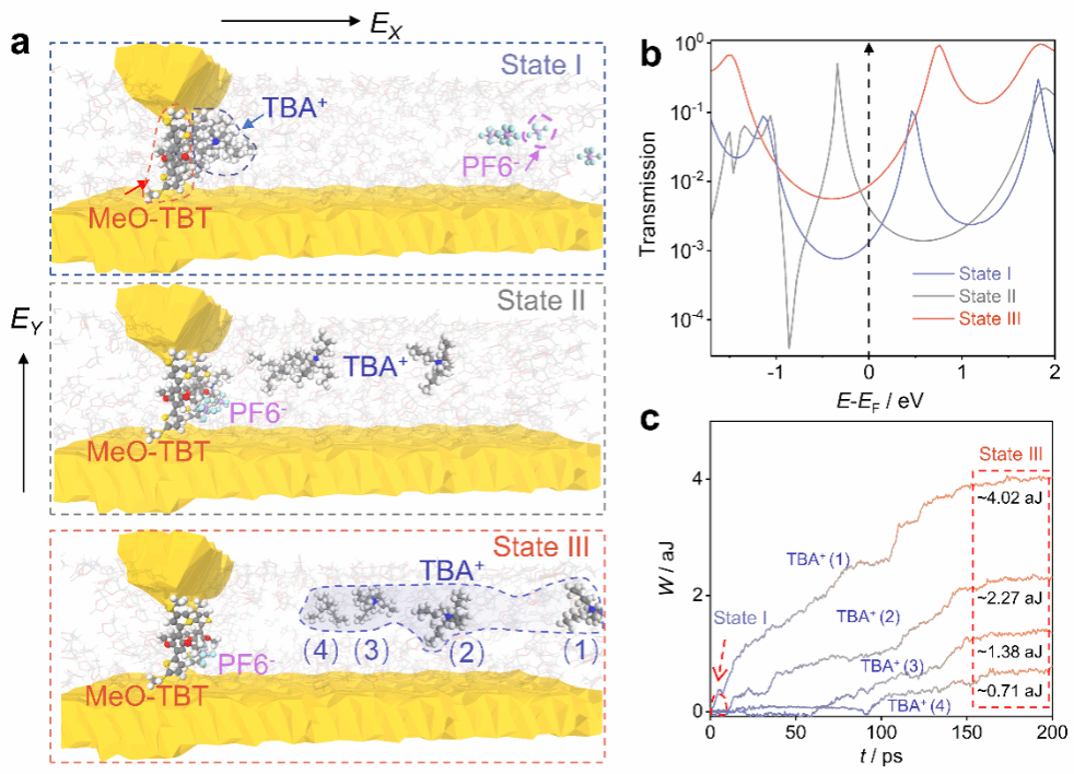 MeO-TBT分子内部存在一种O-S构象锁(噻吩S原子和甲氧基的O原子之间的非共价作用),相当于给分子的形状加了一道“隐形卡扣”,让它更倾向于待在某些构型中。当施加栅压脉冲时,电解质中的四丁基铵阳离子(TBA⁺)会被驱动靠近分子,并与分子中的O-S偶极产生离子—偶极作用。这种作用会削弱原本的构象锁,让分子更容易发生构型变化。
