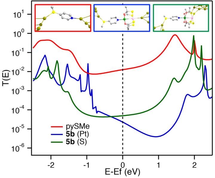 图4:pySMe、5b(Pt连接)、5b(S连接)的计算透射谱图