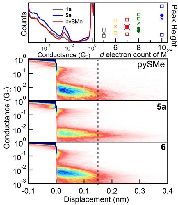 图3:(A)1a、5a、pySMe在1mM条件下的一维电导统计图;(B)、(C)和(D)是pySMe、5a、6在1mM条件下的二维电导统计图;(E)M为Mn(灰色),Fe(黄色),Co(红色),Ni(绿色),Zn(蓝色)时的异双金属灯笼型分子在1mM条件下的pySMe标志峰高