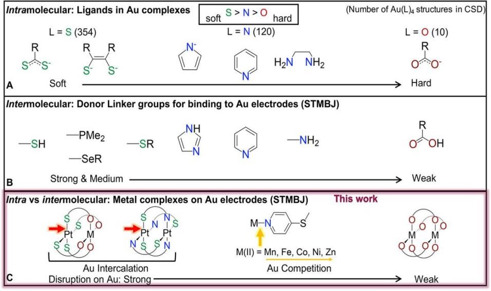 作者首先对能够与金原子形成配位的分子以及目前常用于单分子检测的锚定基团进行了归纳,发现不同性质分子的使用趋势是相似的。如图1所示,巯基/硫醇盐作为软性的代表,是目前做常用的连接基团,而硬性代表的含氧基团很少用于这类连接,而对于软性和硬性之间的氨基或是吡啶分子,目前也已被证明能够在金属与分子间形成足够坚固并且具有一定选择性的连接键。通过从含氧基团到氨基再到巯基,基团软硬程度不同对分子-金锚定强度的改变,肯定了通过HSAB理论对金属原子与分子间装配指导的合理性。