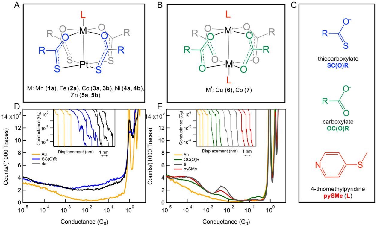 图2:(A)以SC(O)R为骨架的灯笼型异双金属分子;(B)以OC(O)R为骨架的灯笼型同双金属分子;(C)SC(O)R分子、OC(O)R分子及pySMe分子;(D)和(E)是1mM条件下不同分子的一维电导统计图