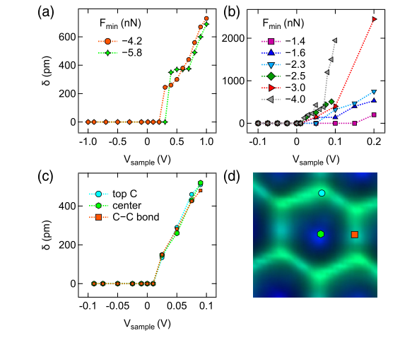 图2:(a)清洁石墨烯的δ-Vsample曲线;(b)嵌入Li的清洁石墨烯的δ-Vsample曲线,Fmin表征针尖的差异。(c)嵌入Li的清洁石墨烯的δ-Vsample曲线与石墨烯中碳原子的位置依赖性;(d)清洁石墨烯蜂窝单元的恒高扫描隧道显微镜图像。