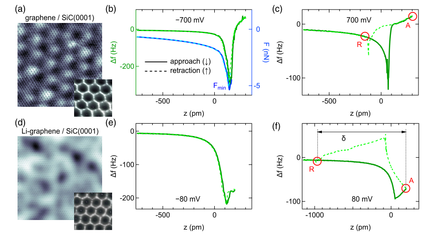 图1:(a)清洁石墨烯的恒电流扫描隧道显微镜图像;(b)对于清洁石墨烯,Vsample=-700mV (实线表示针尖下降过程,从左到右;虚线表示针尖上升过程,从右到左)。垂直力F显示为下方实线(下降)和虚线(上升)(Fmin,最大吸引力点);(c)对于清洁石墨烯,Vsample=-700mV (实线表示针尖下降过程,从左到右;虚线表示针尖上升过程,从右到左);(d)嵌入Li的清洁石墨烯的恒流扫描隧道显微镜图像;(e)对于嵌入Li的清洁石墨烯,Vsample=-80mV (实线表示针尖下降过程,从左到右;虚线表示针尖上升过程,从右到左);(f)对于嵌入Li的清洁石墨烯,Vsample=-80mV (实线表示针尖下降过程,从左到右;虚线表示针尖上升过程,从右到左)。为Δƒ的循环宽度,δ定义为去激活反馈控制并将尖端收回到隧道范围之前的尖端位置,在(b)、(e)中δ=0。
