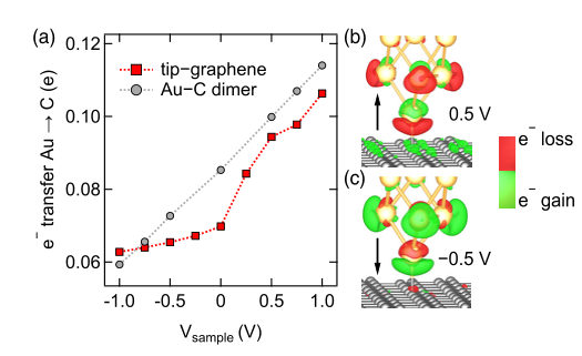 图4:(a)根据针尖-石墨烯模型(正方形)和金-碳二聚体(点)计算的样品,对从金到碳的电子转移进行赫希菲尔德电荷分析;(b)尖端-石墨烯模型在Vsample=0.5V时,相对于0 V的感应电子密度。红色(绿色)阴影区域描绘了密度等值面为20e/nm3的电子损失(增益);(c) 尖端-石墨烯模型在Vsample=-0.5V时,相对于0 V的感应电子密度.箭头方向为电场方向。