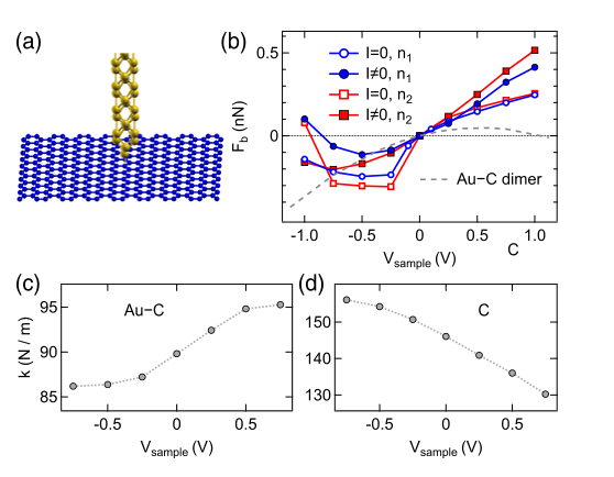 图3:(a)准一维金尖端和独立石墨烯的模型几何结构。(b)在一维金尖端和独立石墨烯的模型中几何图形(实线)和金-碳二聚体(虚线),计算的吸引力Fb (Vsample),电场垂直于石墨烯平面施加。电子密度n1<n2由狄拉克点能量调节,n1为400MmV,n2为700MmV。实心(空心)符号反映了电流I的存在(不存在)。(c)在n1掺杂下,Au-C键弹簧常数K -Vsample曲线;(d)在n1掺杂下,置换碳原子的弹簧常数K -Vsample曲线。