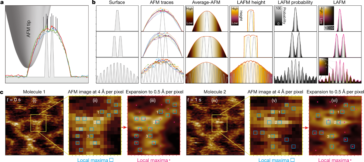 图2. LAFM原理。 (a)AFM针尖扫描高分辨率地形的示意图。虚线,理论等高线。彩色线条,三种具有代表性的模拟地形痕迹。(b)LAFM方法在具有一个(顶部)、两个(中间)和多个(底部)高度调制表面特征的表面上的模拟(n = 1000)。表面:表示理想化的表面特征(灰色)。AFM轨迹:9条具有代表性的模拟地形轨迹(彩色线),检测到局部极大值(叉)。平均AFM:平均形貌(n = 1000)。LAFM高度:检测到的局部极大值的平均高度。LAFM概率:检测到的局部极大值的峰值概率分布。LAFM:用峰值概率合并实空间高度的LAFM映射。(c)高空间分辨率地形局部极大值检测。(i), (iv),两个代表性的序列(t = 0 s, t = 1 s) annexin-V(A5)三聚体的原始数据图像。(ii), (v),放大的原始数据视图(每像素4 Å)。蓝色方块。在两幅图像的相同像素位置检测到标记为“1”、“2”和“3”的局部极大值。(iii), (vi),相同的图像区域后的图像扩展(每像素0.5 Å)。红色方块,局部最大像素。