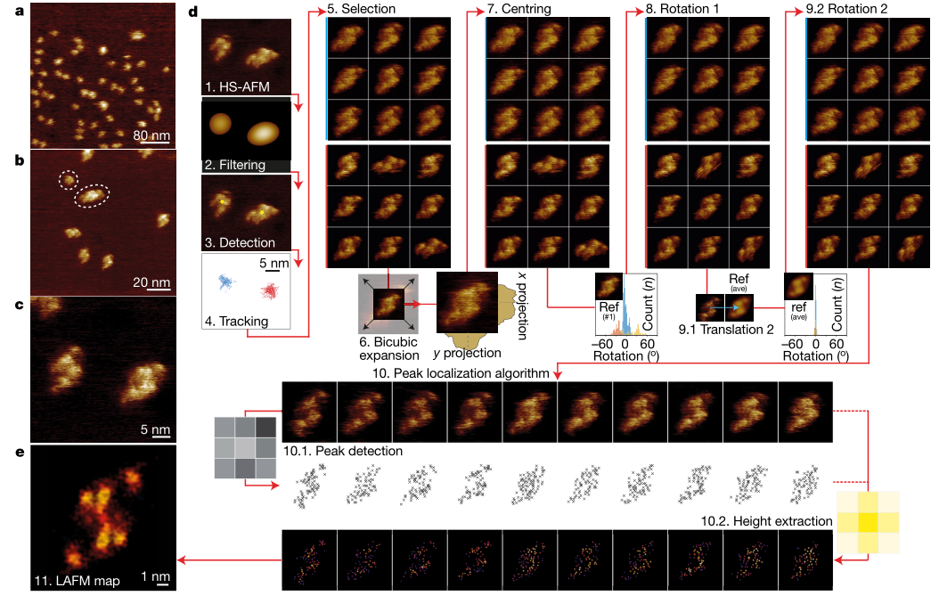 由于二聚体可以表现出平移和旋转的特性,该文章提出了一种广义的LAFM测量方法(图4d):1.获取HS-AFM图像;2.低通滤波;3.自动检测粒子;4.在整个观测过程中粒子被追踪;5.粒子在图库中被选取;6.双三次插值算法扩展图像;7.精确粒子中心化;8.与任意分子旋转对齐;9.1.第二次横向排列;9.2.第二次旋转排列;10.1.检测局部最大峰值;10.2.以1.4Å为概率半径提取;11.最终所有的检测结果合并到高度-概率的LAFM图中。