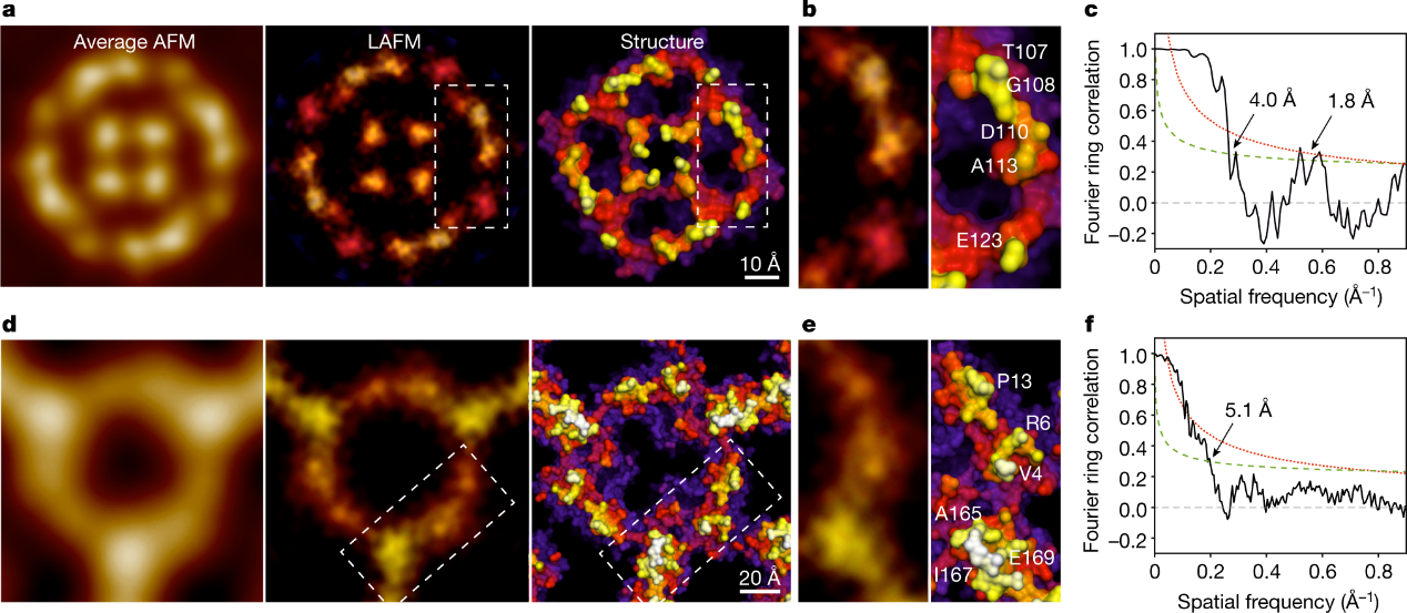 图3 . AqpZ和A5的LAFM。 (a-c), AqpZ; (d-f), A5。(a, d),左,平均AFM图;中间,LAFM地图;右边是x射线结构的表面表示。(b, e), LAFM图和x射线结构的详细视图,标记了可识别的残基。(c, f), FRC分析的LAFM半映射。