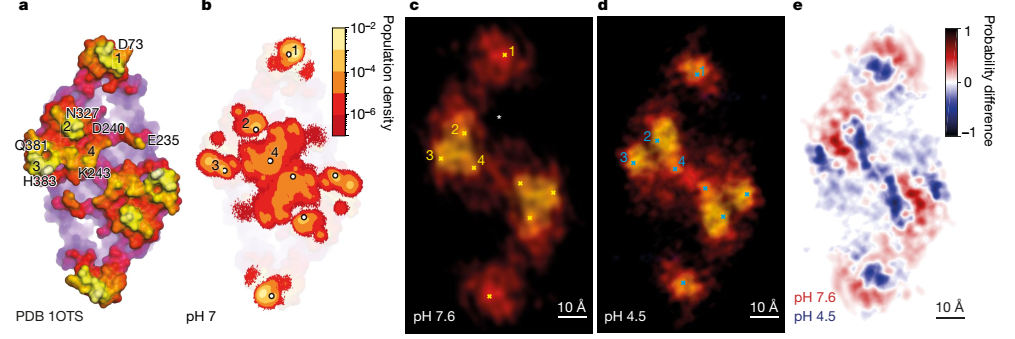 图6 CLC-ec1在中性和酸性pH下的构型变化。(a),pH值9.5条件下的CLC-ec1的细胞外表面;四个主要突起(1-4)中的残基被标记。(b),对数尺度的原子位置密度图。 细胞外表面Z坐标最高的原子位置的对数尺度群体密度图,该图来自在pH值为7时5.6 ms的分子动力学模拟结果。主要的突起(1-4)被标记为对每个群体峰值的贡献值:(1)D73(97%),A72(2.7%);(2)N237(91%),D240(2.2%);(3)Q381(42.3%),H383(54.7%);(4)K243(52%),D240(21.7%),S245(3.4%)。(c),(d),CLC-ec1在pH 7.6(c)和pH 4.5(d)的LAFM重建图像。离子通路入口用星号标出。四个主要的突起(1-4)被突出显示,以便与X射线结构和分子动力学模拟的群体密度图进行比较。(d),在pH7.6(c)和pH4.5时CLC-ec1 LAFM重建的差异图,差异图突出了四个主要突起的构象变化。特别是峰1向二聚体轴线移动了约6-Å。(e),在pH为7.6和4.5时,CLC-ec1 LAFM重建之后的差异图。