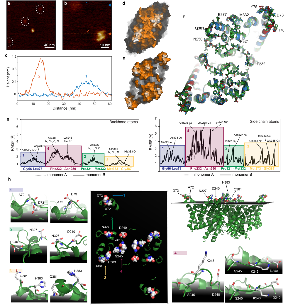 在X射线结构表面的基础上(图6a),文章标记了预计会在AFM中产生信号的突出残基:B-C环的Asp73、I-J长环的Glu235、Asp240和Lys243、L-M环的Asn327以及N-O环的Gln381和His383。同时为了补充完善LAFM的解释,作者还使用了分子动力学模拟,将静态的X射线结构转换成动态的分子结构,绘制了CLC-ec1细胞外表面Z坐标局部极大值分布的群体密度图,该图反映了膜突起的侧链运动。(图6b,图5g,h)。分子动力学轨迹显示出结构波动是如何被探测到的以及是如何从合并的结构波动中提取高分辨率下的蛋白质表面的氨基酸残基的信息。