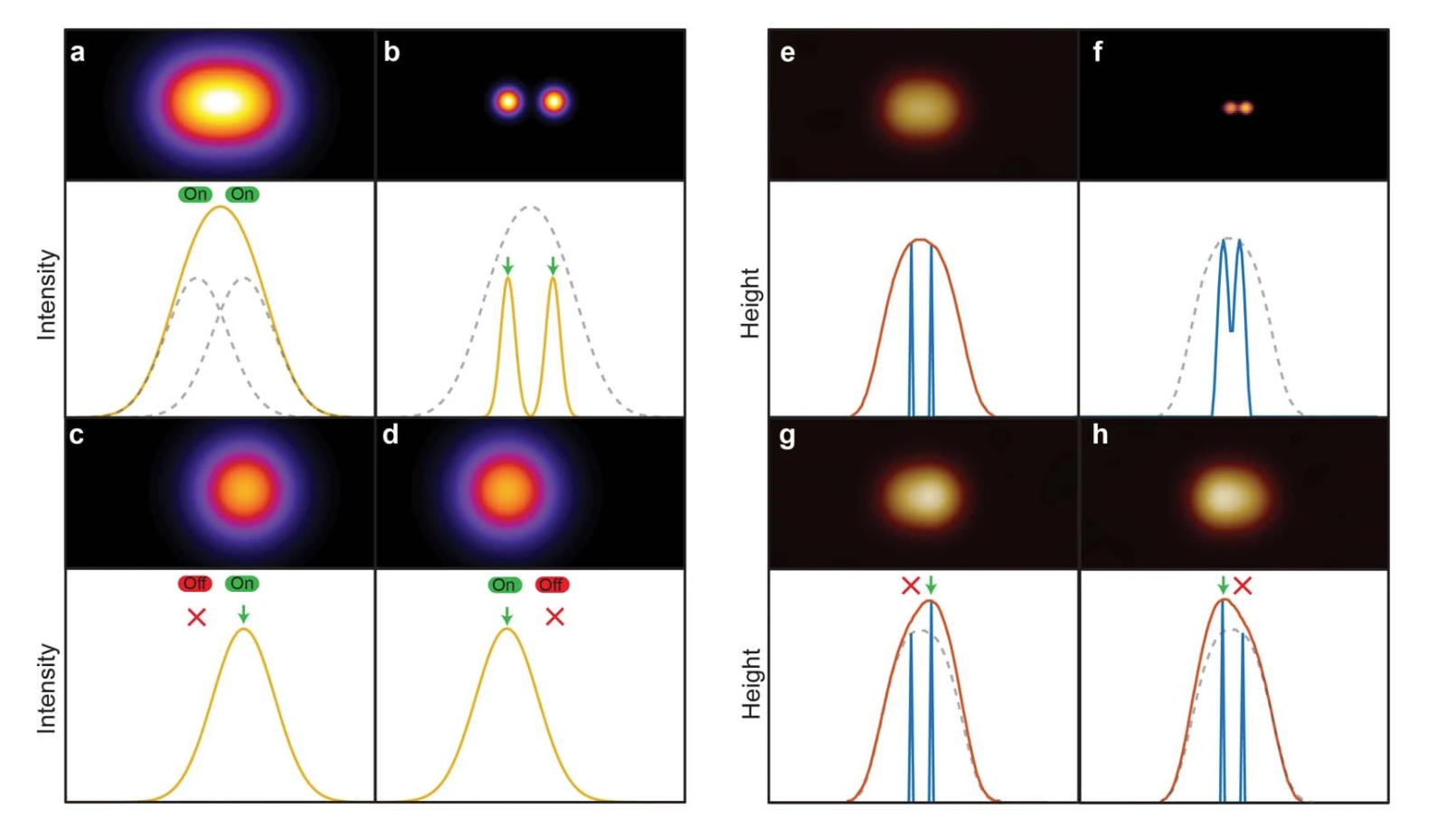 图1. PALM中的定位原理。 (a)位于小于衍射极限的分离距离处的两个荧光分子的衍射极限图像/轮廓。 (b-d)应用PALM后荧光团的空间分辨位置。