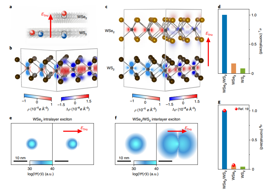 上述实验结果说明单层和双层中的电子-空穴对对于垂直于平面的太赫兹电场的响应差别非常大,因此作者通过DFT计算单、双层的层内以及层间的电子空穴对的极化情况。对于没有施加偏压的单层样品,其沿面外方向电荷分布几乎是镜像对称的(图2b)。而对于双层异质结构,双层异质结构表现出明显的不对称性,电荷甚至在 WSe2 中的硫族元素原子之外偏转(图2c)。再通过比较了电子空穴对的面外极化率,可以发现异质结构中波函数的有限扩展大大增加了外部刺激引起的波包偏转最多一个数量级(图2d)。图2g至图2f也展示了电子空穴对在WSe2和WS2材料中由于空间的分离减小了库伦作用,其极化率比WSe2单层激发的层内极化率有了一个数量级的提升,这也与上述图1e中的实验结果相符。