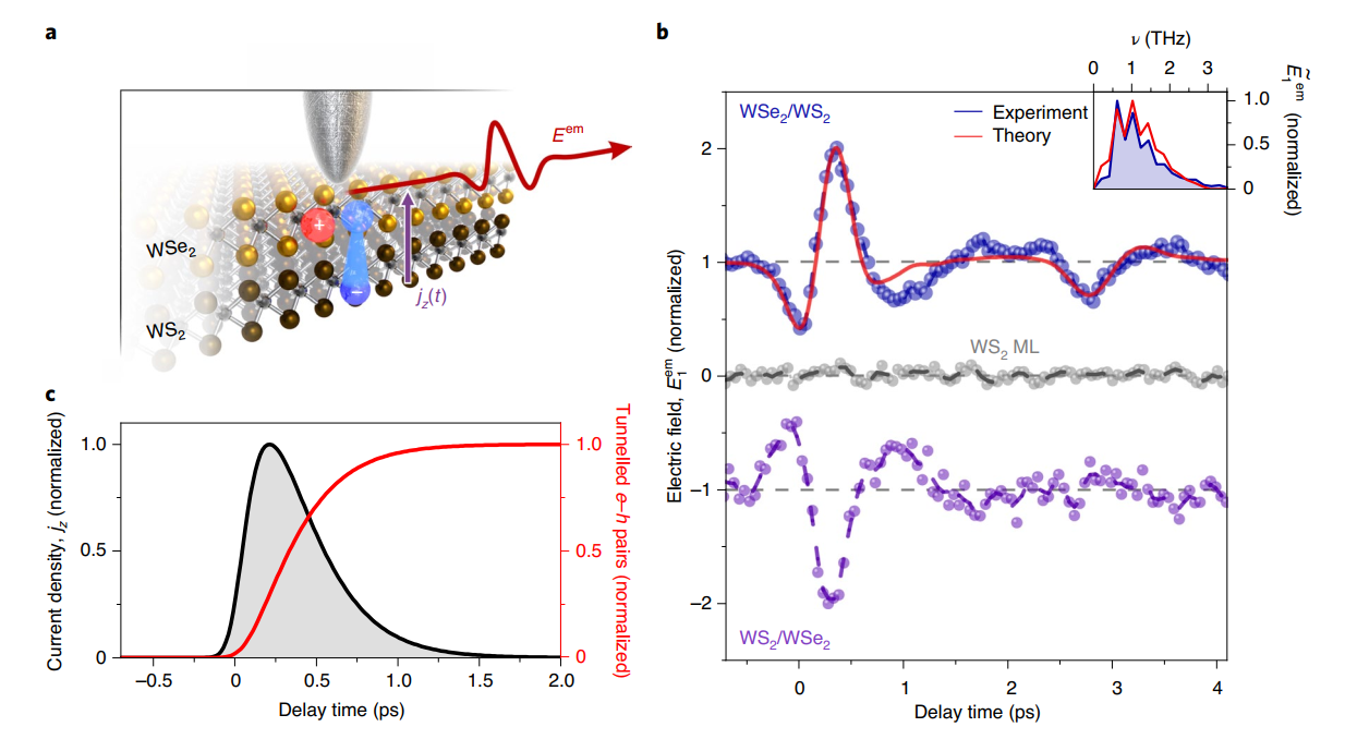 图3:(a)基于层间隧穿会产生与时间相关的电流密度函数并释放太赫兹波的示意图 (b)通过样品WSe2/WS2,WS2和WS2/WSe2的太赫兹发射谱电场分布 (c)源自层间电荷转移的面外电流密度jz(灰色)和隧穿电子空穴对的积累(红色)