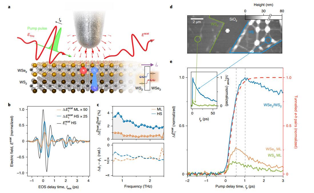 隧穿效应是量子力学的最基本的表现之一,扫描隧道显微镜(STM)的发现以及光学泵浦-探测技术的联用使得人们可以直接分析导电样品的纳米尺度的量子隧穿效应以及超快动力学行为。然而,这项技术需要导电样品,并且扫描隧道显微镜结中的电流可能会扰乱样品内的本征隧穿过程。此前有人通过a.c耦合STM去对绝缘体进行表征,但其无法提供的超快时间分辨率,因此德国雷根斯堡大学物理系的RUN机构(Regensburg Center for Ultrafast Nanoscopy) 基于层间激子更易被电场极化的原理,用散射式扫描近场光学显微镜(s-SNOM)以及激光太赫兹发射纳米显微镜(LTEN)对WSe2/WS2异质结构进行超快层间输运表征,揭示了深亚波长、纳米尺度上层间激子的局部形成和湮灭的显着变化并验证了该原理的可行性。由于整个过程不会驱动外部电流,所以这个概念有望被用于在亚周期时间尺度上观察绝缘、导电甚至超导系统中的隧穿效应。