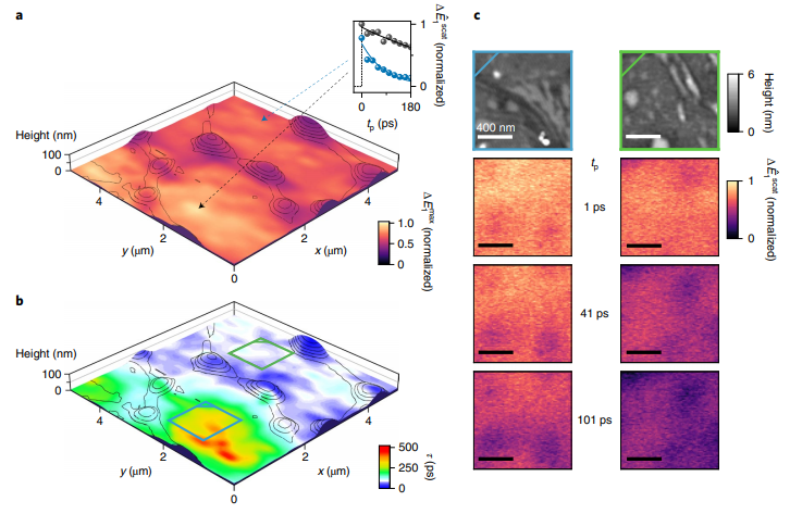 上述实验不仅证明该技术能够探测层间激子的超快动力学,还证明能够通过该技术实现纳米级的空间分辨。因此作者将该技术扩展到飞秒成像,观测了异质结表面的不均一性以及空间上的不均匀动力学(图4a和图4b),其中平坦区域之间的e-h寿命显著高于非平坦区域,这是因为非平坦区域内的异质结构的空间分离,所以会表现为单层结构的层内激子引起的忽略不计的密度和短寿命。并且在图4c中作者探究了同为平坦区域的激子寿命的差异性,发现了异质结构在纳米尺度上保持完整,并且层间激子可能对局部介电环境的细微变化具有鲁棒性,为之后范德华异质结的优化提供新的认识。